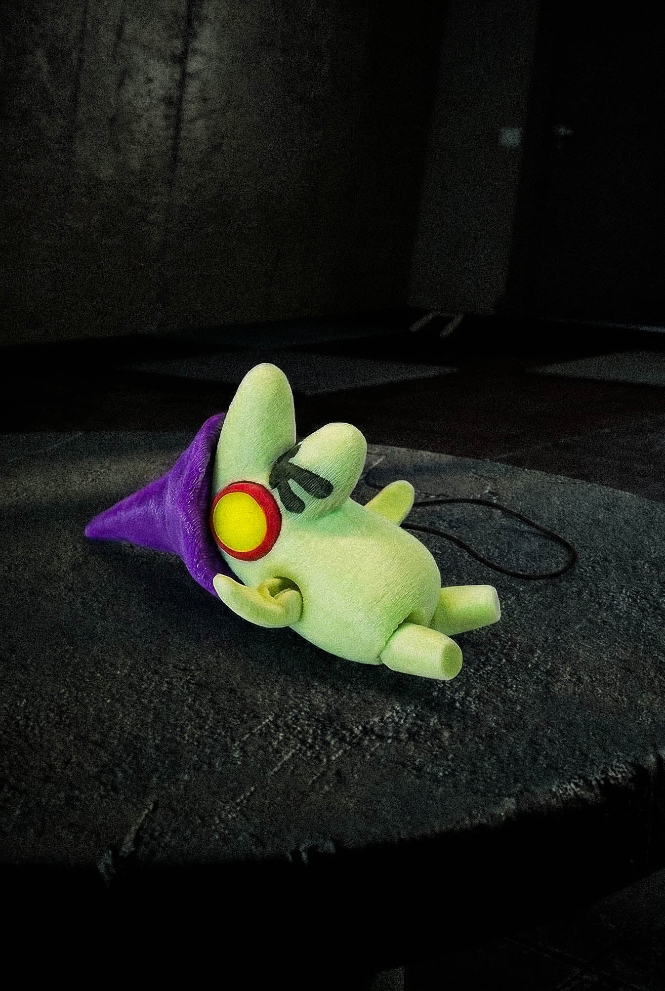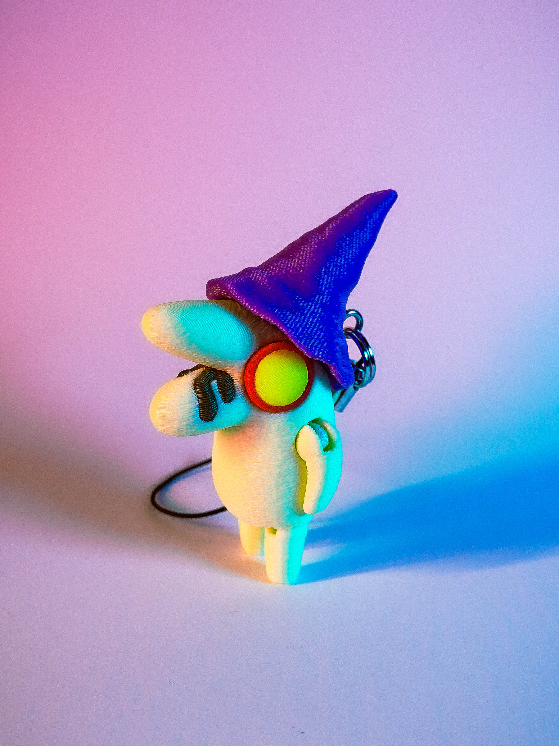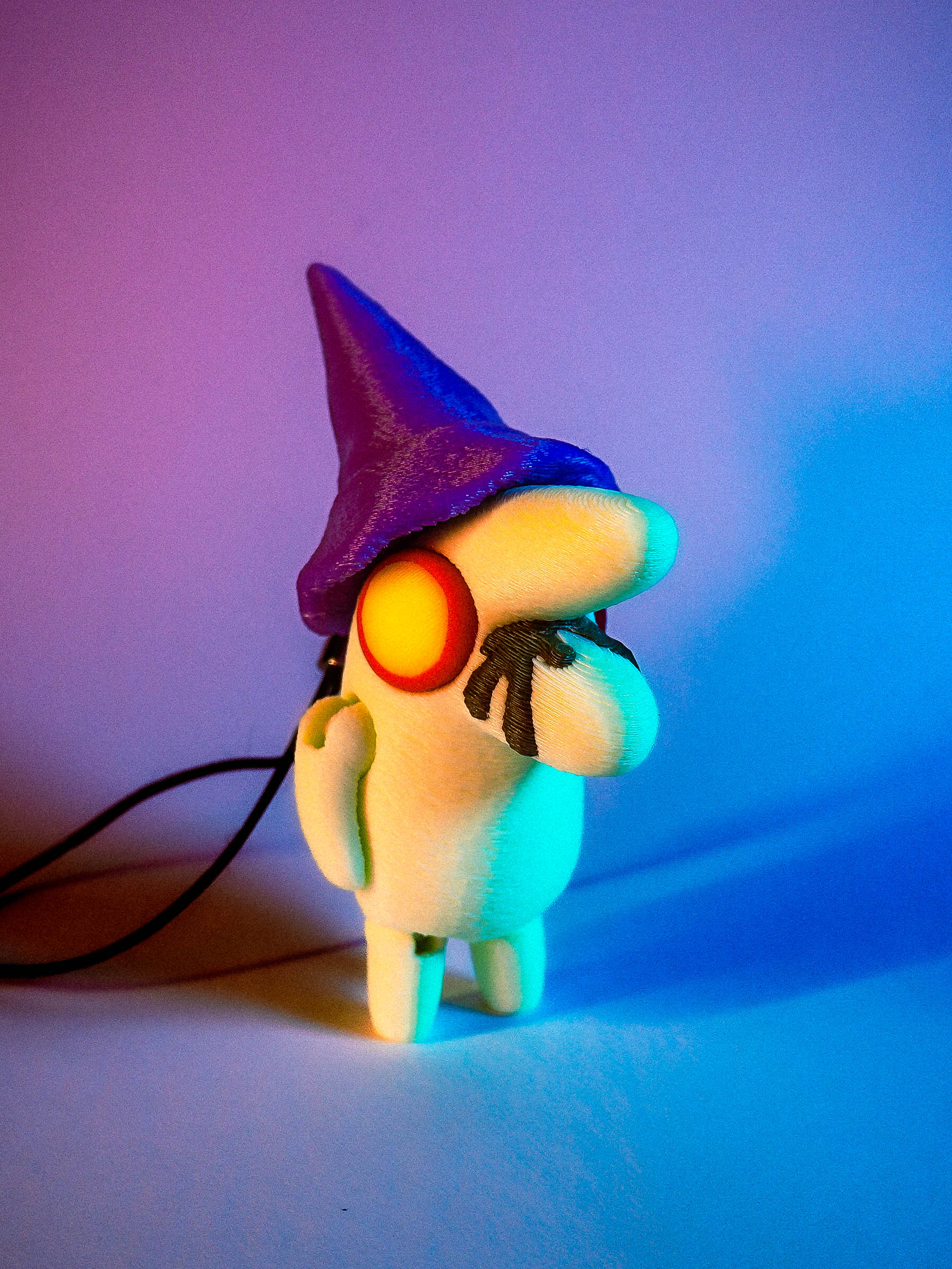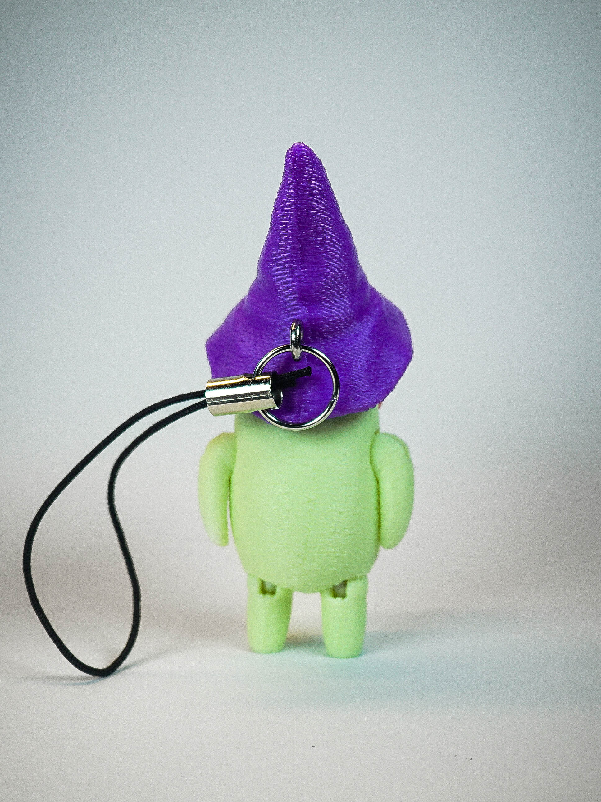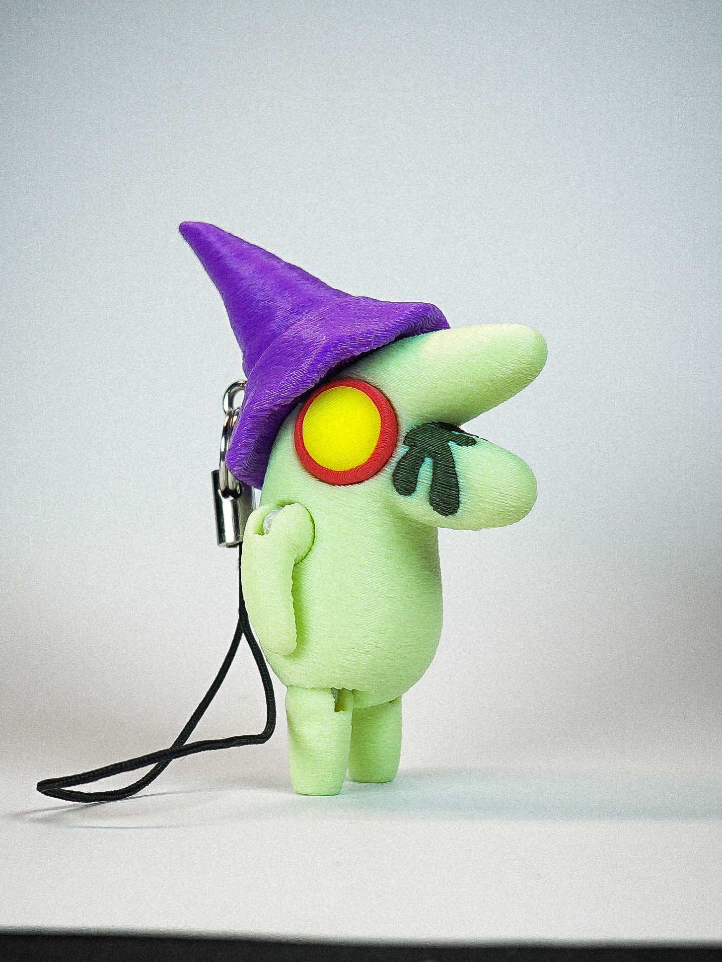 A charm lanyard is secured to the back of Glep's hat to allow for epic DANGLING action!